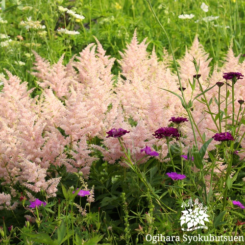 小型のアスチルベで、可愛らしいサーモンピンクの花を咲かせる