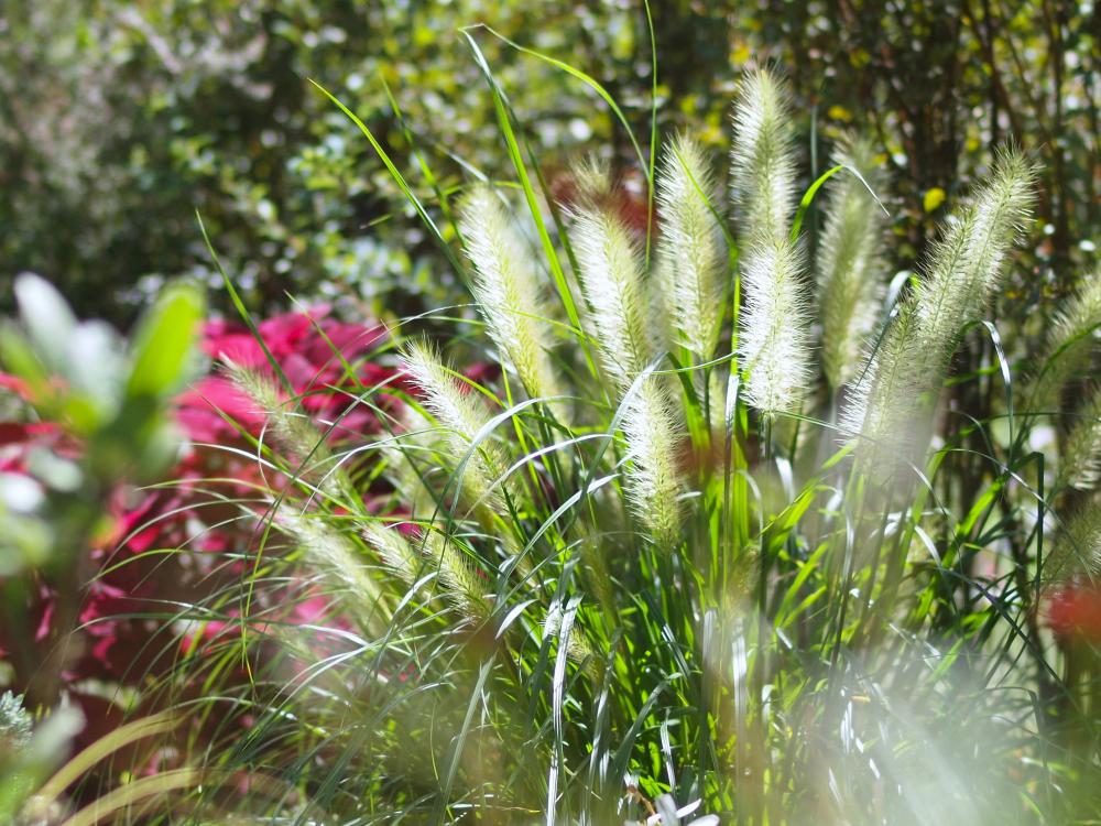 ペニセタム アオチカラシバの穂が陽ざしを受けて白く輝いています(^^♪  奥の株は昨年の冬に株分け、根が固まってしまって、手ではとてもわけられず、のこぎりで切り分けました