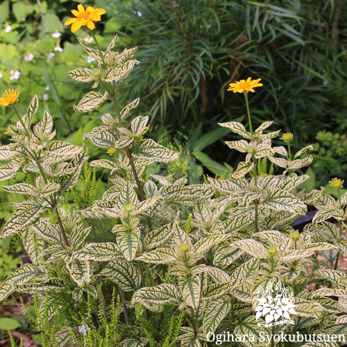 葉が展開すると白斑に変化し、夏をメインに黄色い花が咲き、対比が楽しめる